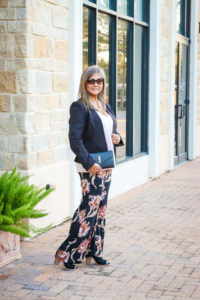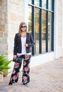 Bringing florals on to your pants makes such a bold statement. I think it speaks volumes in saying that you are a confident and strong person. When you slip on a pair of floral pants, trust me…you will get noticed for the print. After all, prints are bold! Here’s a fabulous pair of pants with a nice large floral print. I’ve styled it for a career look with the blazer; however, simply remove the blazer and you have easily transitioned into a dinner look that is sure to turn a few heads.