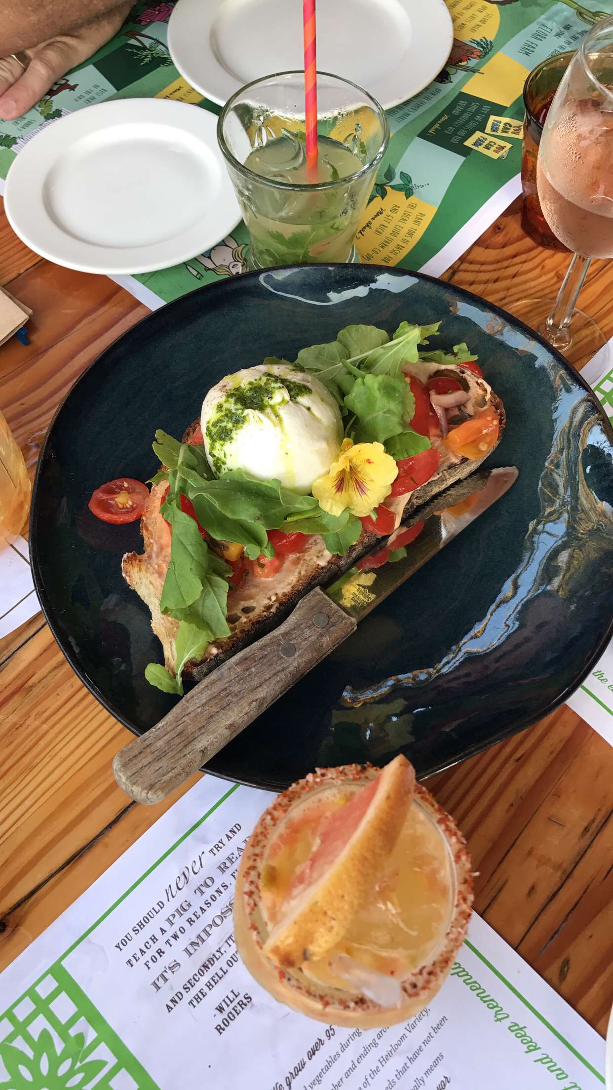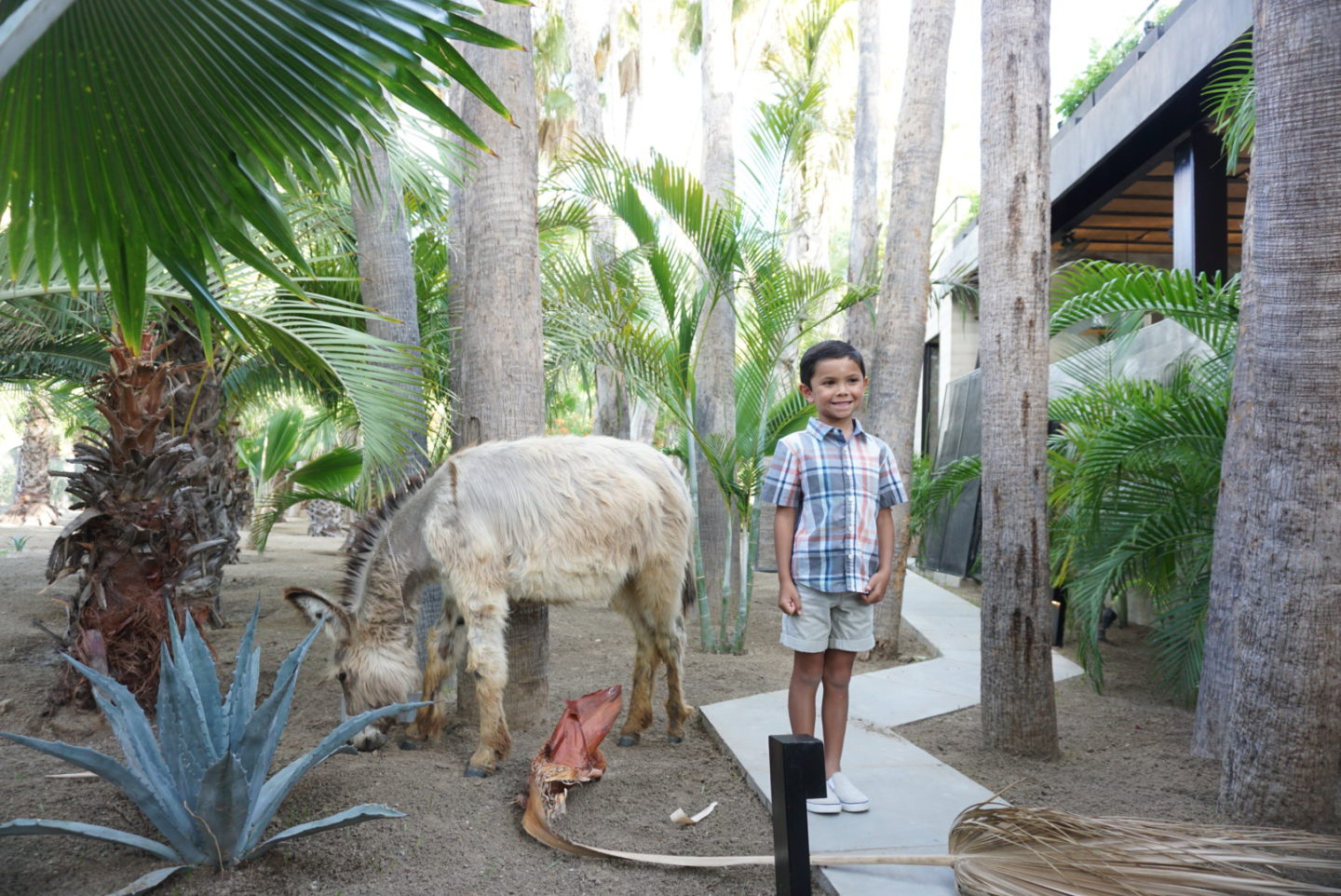 Located in the foothills of San Jose del Cabo’s mountain valley, is this fabulous boutique hotel resort and farm to table restaurant. It is situated on 25 acres of greenery which is home to elegant treehouses, organic farms and this amazing restaurant. I loved everything about this place and the vibe was so much fun. As soon as we stepped into the hostess area, we were greeted by a DJ playing some beats. You knew that moment you were in a trendy and cool place. We took a moment to walk around and explore the property before being seated. We were able to find the resort mascot/pet who happens to be the cutest donkey by the name of Burrito. Such a little cutie, my six year old really enjoyed seeing him along with the other farm animals including some peacocks, goats, and other small animals. The grounds of this place was absolutely beautiful.