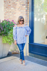 So, the start of school and football means that Fall begins to sneak in and then the cooler weather comes (that part I get excited about). I love layering but, before we say bye completely to Summer. There are some amazing sales out there. It’s the best time to get some great layering pieces that are on Sale along with any pieces you have been wanting to have from Summer collections. I had the luxury of having my first photo session with The McCraes Photography and I must say I wasn’t sure what to expect. Given that I am new to blogging and very green, Lauren made me feel so comfortable and relaxed. Over the next few blog posts, I will be sharing outfits from the shoot. Today’s outfit is the most adorable Off The Shoulder or Cold Shoulder top that I was able to get from Loft. Loft is having their Summer Sale with up 50% off Can’t Miss Deals + Up to 75% off Original Prices. I’ve included details on my outfit below along with a few other off the shoulder Loft style pics. Hurry sale ends tomorrow!